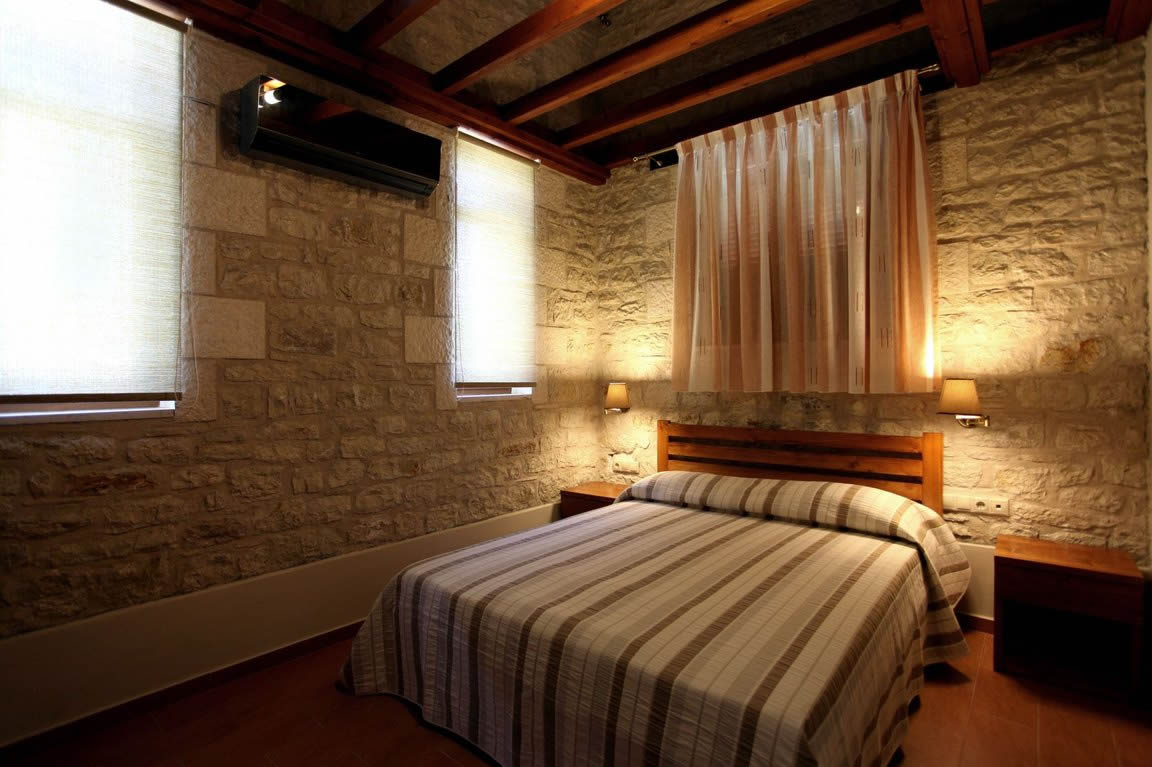 The “Asfendamos” complex consists of nine independent, single-storey stone houses, each with a private veranda. Each residence includes one bedroom and an open-plan living area with kitchen. They can accommodate up to four adults, with the option to add a baby cot in the bedroom.
